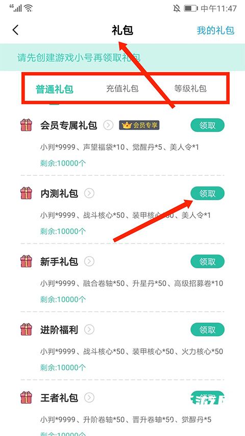 11、在【礼包】界面,可选择“普通礼包”、“充值礼包”、“等级礼包”进行领取,助你游戏更轻松,