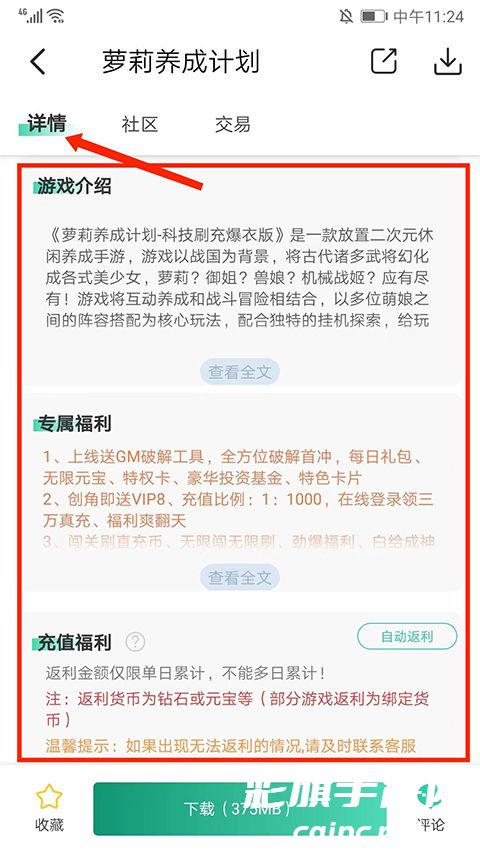 6、在【详情】界面,可看到“游戏介绍”、“专属福利”、“充值福利”等内容,可以更好的了解游戏内容和折扣福利,