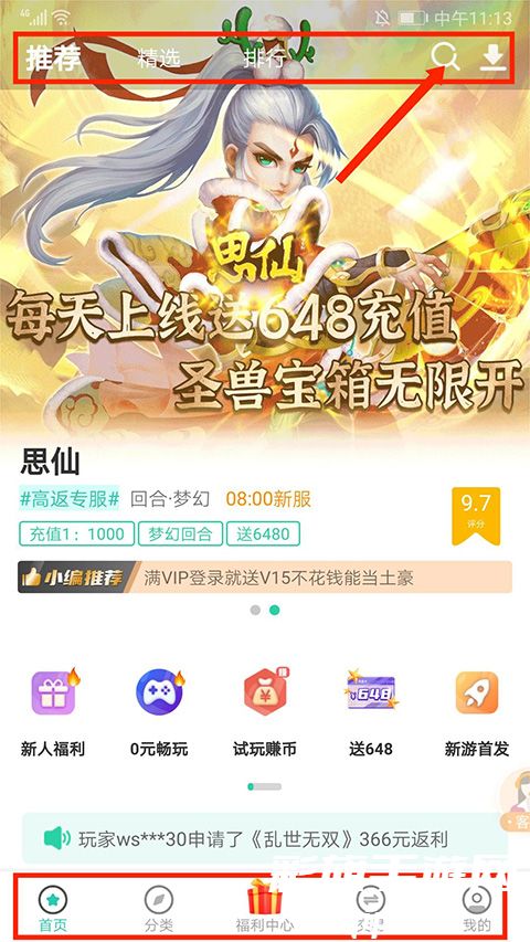 2、进入应用界面,包括【首页】、【分类】、【福利中心】、【交易】和【我的】栏目,在【首页】界面将游戏分为“推荐”、“精选”、“排行”和“搜索”,这里以“搜索”为例,选择右上角“放大镜”图标,