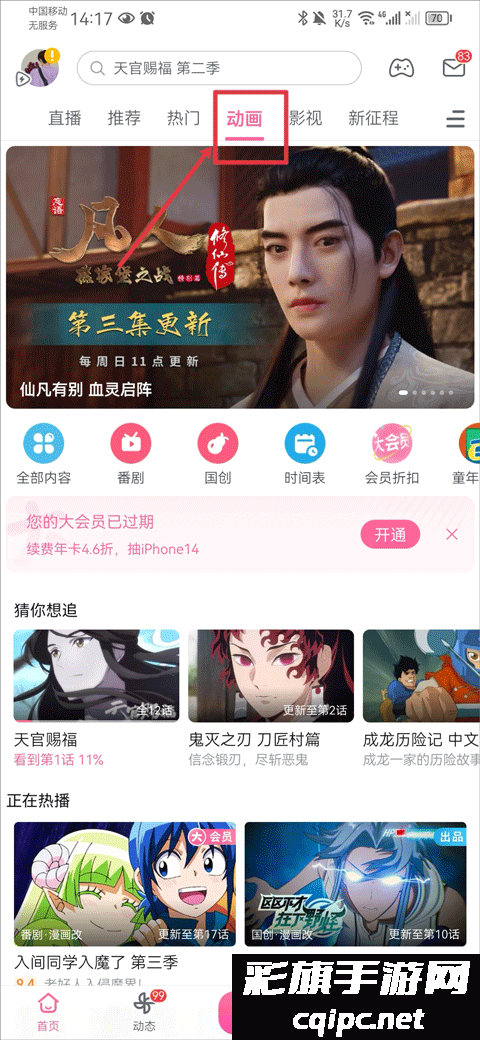 1、打开哔哩哔哩动漫app最新版后,在首页中点击动画界面,并选择你要观看的动画