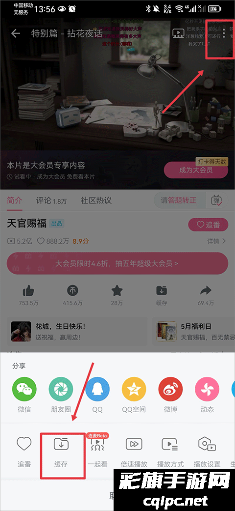 2、在动画观看界面中点击右上角三点后,在点击下方缓存按键