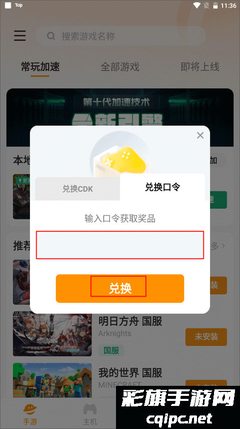 3、从默认兑换CDK切换到兑换口令,输入你早已得到的口令号码,全部输入好后点击下方的兑换按钮即可兑换成功。