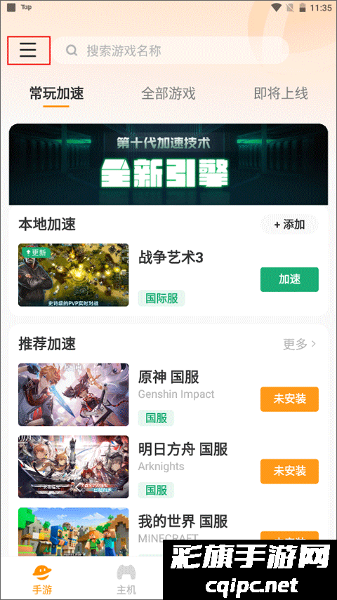 1、首先从加速器排行榜中的免费试用中找到雷神加速器主播口令,将口令复制到手机上。然后打开雷神加速器app,并进入主界面【手游】,这个界面包含常玩加速、全部游戏、即将上线这几个部分,点击左上角的三横图标。