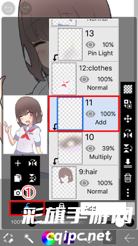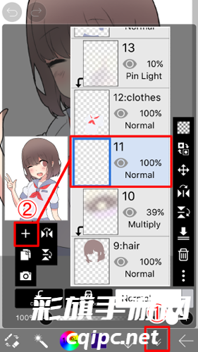 同样, 点击加号按钮在 "图层" 窗口中, 为阴影添加图层, 使其成为当前图层, 并将③混合模式 "乘法"并最终转到步骤四剪切on。另外, 将画笔颜色更改为黑色。