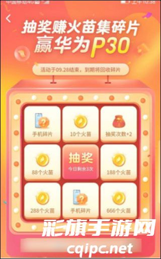 4、抽奖,通过抽奖还有机会获得,手机碎片和火苗,手机碎片抽取到10个就能进行兑换华为p30手机。