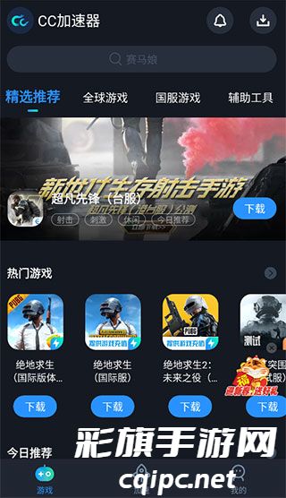 2、游戏页面:精选推荐、全球游戏、国服游戏、辅助工具;
