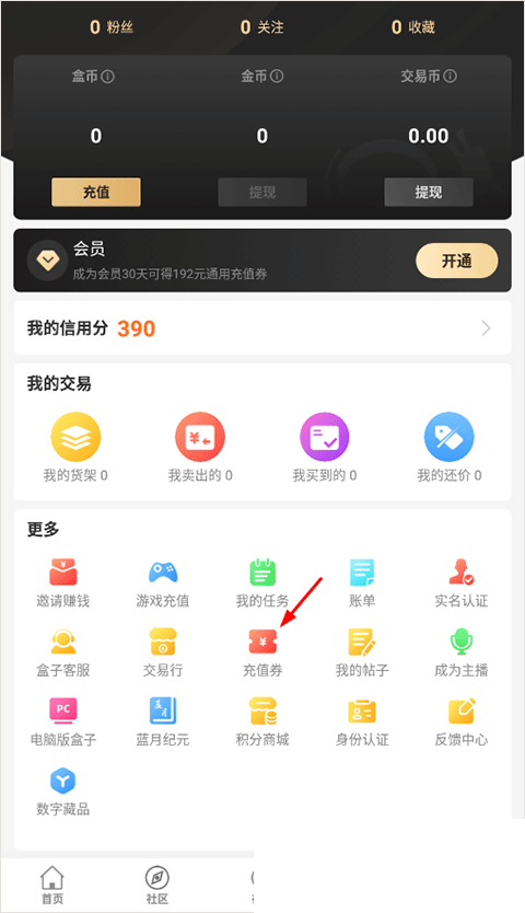1、打开996传奇盒子官方安卓版后,在我的功能模块。选择充值券;