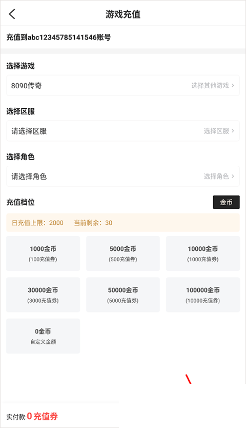 3、找到后选择游戏区服等,充值额度,点击充值即可。