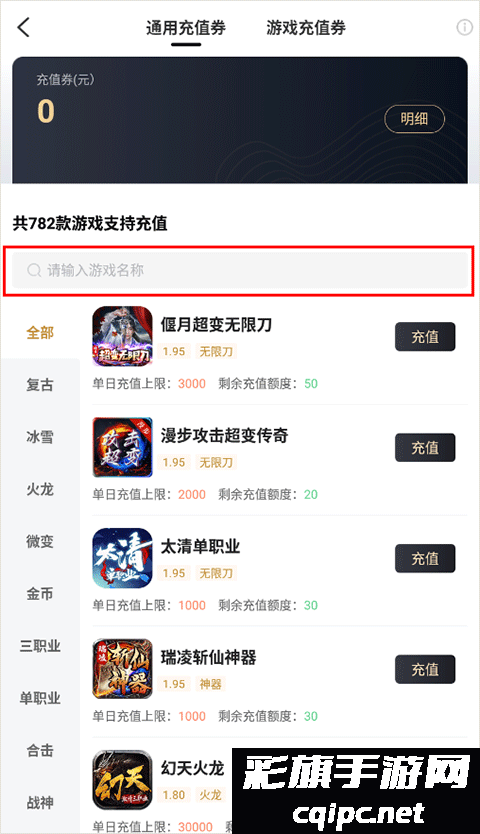 2、搜索你需要充值的游戏,也可以通过分类进行查找;