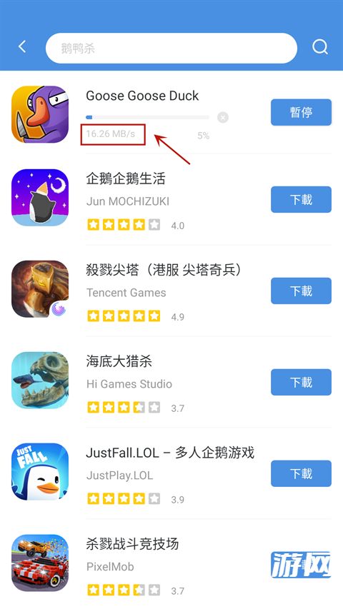 3、小编以最近大热的鹅鸭杀游戏为例,在上方搜索栏输入“鹅鸭杀”即可在下方查看该游戏的评分以及厂商信息,点击一键下载即可。