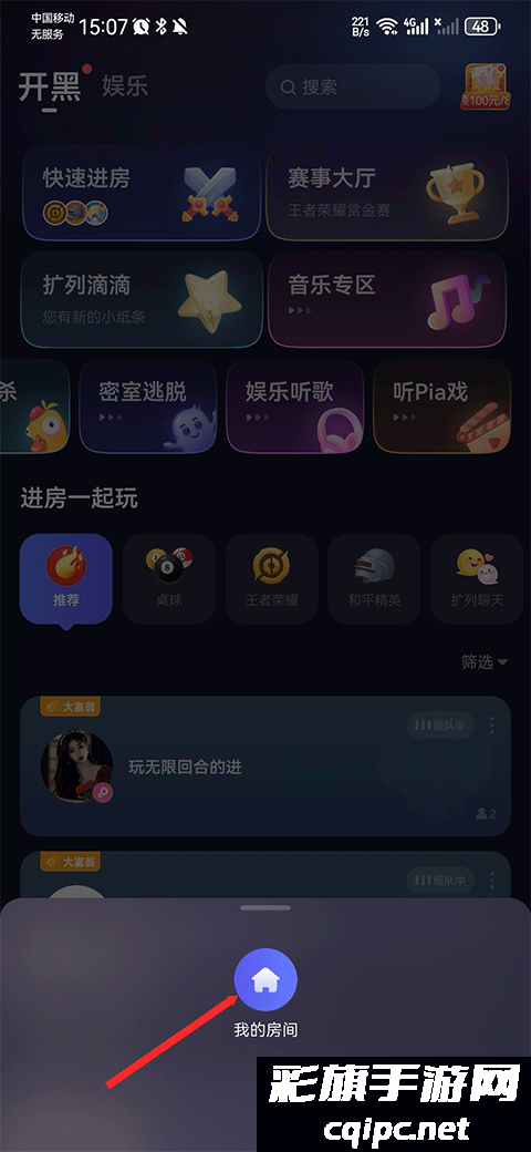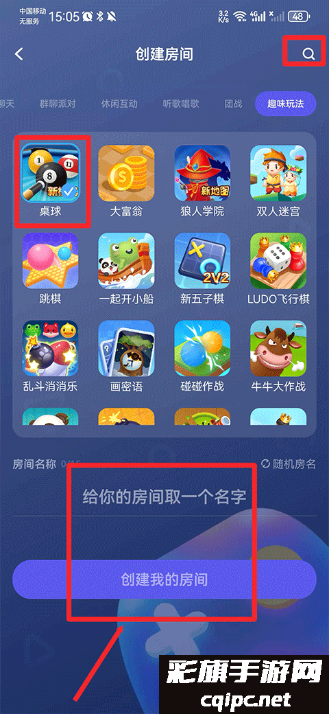 3、然后在趣味玩法类中找到桌球,找不到的可以使用右上角放大镜功能搜索桌球,然后为房间设置名称后点击创建我的房间