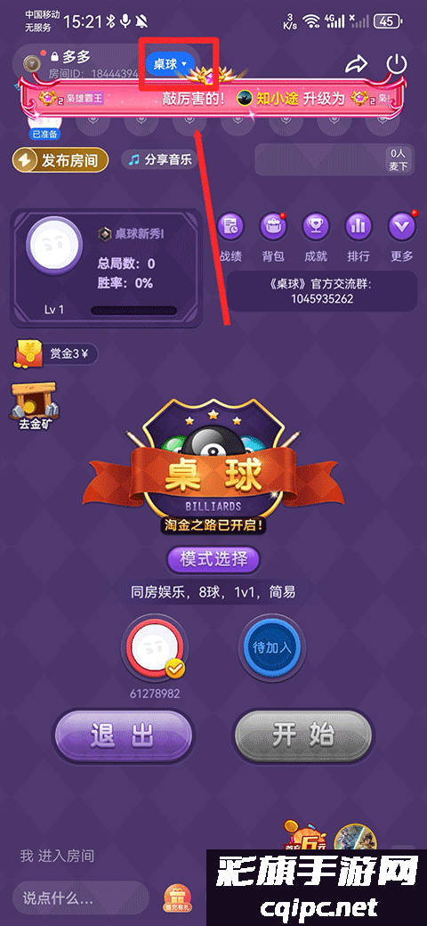 4、创建完成就可以在房间内进行桌球游戏啦,若需结束点击右上角退出功能即可