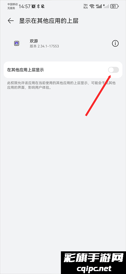 4、然后在手机设置内找到欢游app,并将在其他应用上层显示功能开启就可以啦