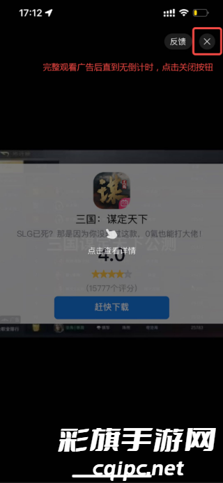3、完整看完广告,点击关闭按钮即可免费加速