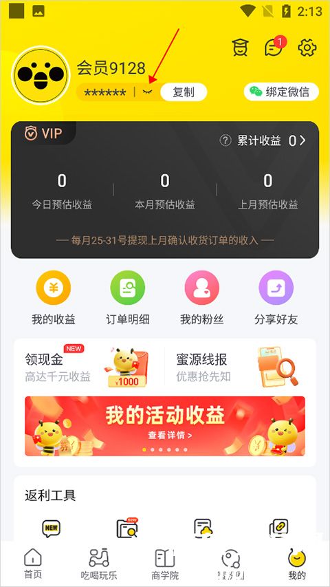 1、用户登录成功成功后进入【我的】页面,在此页面的左上角头像位置就可以看到自己的邀请码(下图红色方框处),点击其右侧的【复制】即可将邀请码复制下来