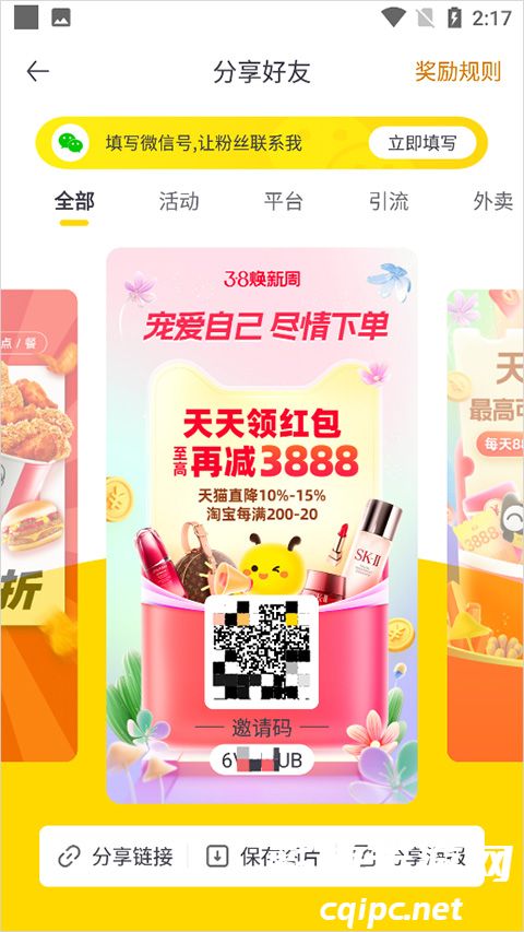 3、用户也可在【我的】页面中点击【分享好友】(上图绿色方框区域),在打开的新页面中也可以看到自己的邀请码