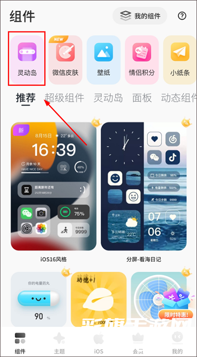 1、下载进入colorful widget app后,在首页的上方点击【灵动岛】