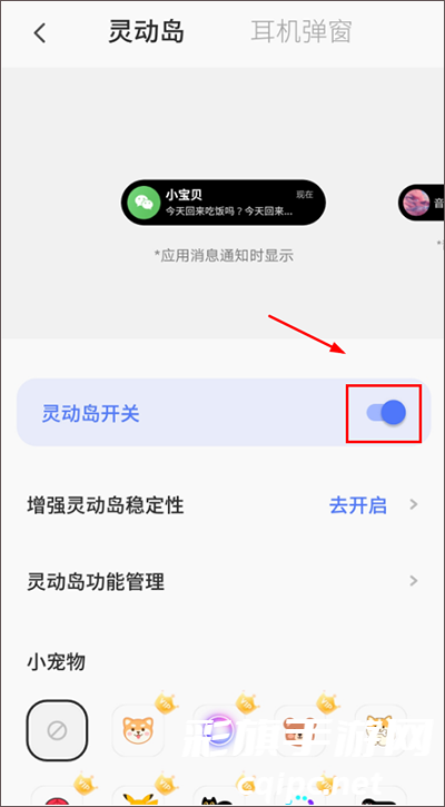 4、在【灵动岛】设置页面,向下滑动,用户可以为【灵动岛】添加宠物,和修改其位置。