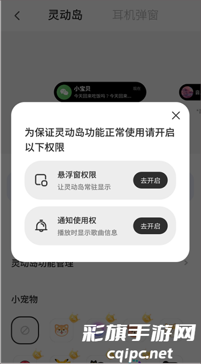 2、在【灵动岛】设置页面,点击【灵动岛开关】,将其打开即可。但为保证灵动岛功能正常使用请用户开启以下权限:【悬浮窗权限】、【通知使用权】。
