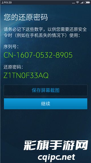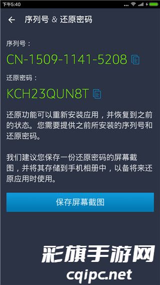 当您完成首次安装安全令以后,就会生成用于手机安全令绑定、以及将重新安装的应用恢复到之前状态的序列号和还原密码。我们建议您在相册中保存一份还原密码的屏幕截图,以备将来还原安全令时使用。(注意:请在原手机安全令尚能使用时,记录其序列号和还原密码)