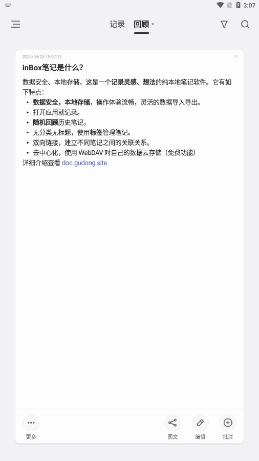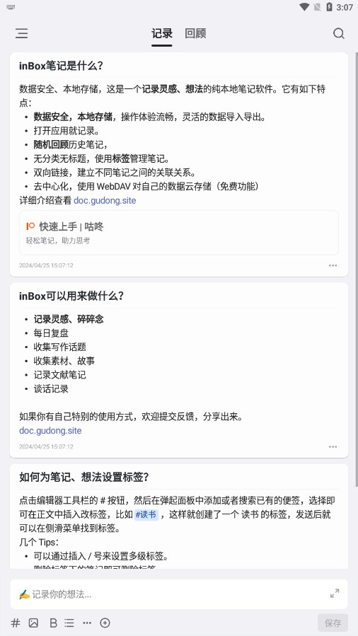 1、 inbox笔记的亮点是其强大的多媒体录制功能,允许用户轻松添加文本,图片和音频等多种类型的内容。
