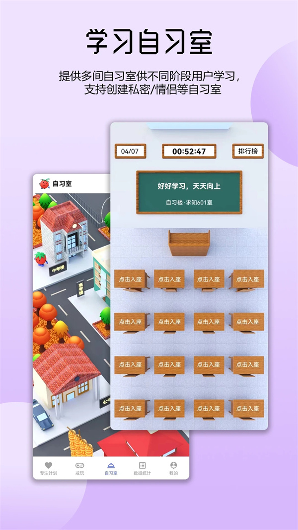 -在线自习室:模拟真实教室,具有中考、高考、考研、公开考试等不同的自学场景,也可以组成团队独自学习;