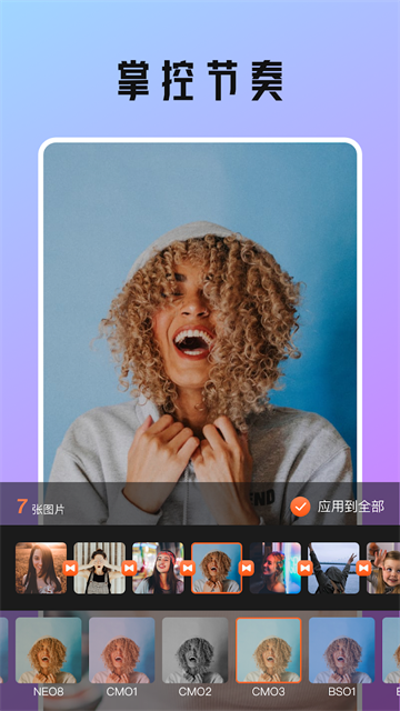 节拍相册软件中用户上传照片,会有很多节奏选择,软件中有很多功能,可以进行智能卡点,字母配置、图片缩放等等功能,软件中用户制作好的照片,还可以一键分享作品,用户还可以将未完成的图片保存在草稿箱,下次进行制作,软件中还有很多音乐,供用户选择,用户也可以搜索自己喜欢的音乐进行制定,软件中用户可以缩放图像,查看需要调整的位置。