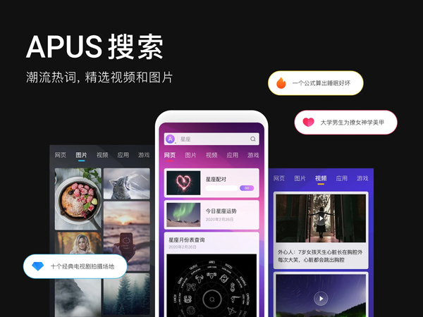 APUS桌面软件中的搜索功能很强大,搜索速度也很快,软件的功能非常齐全,软件中有很多工具提供给用户使用,软件中用户可以一键整理自己的桌面,放进文件夹中,并且用户还可以为文件夹命名,软件中的主题非常多,主题资源非常多,并且主题的种类也非常详细,划分的也非常详细,用户可以快速找到自己感兴趣的主题,软件内还有好多实用的功能提供给用户使用。