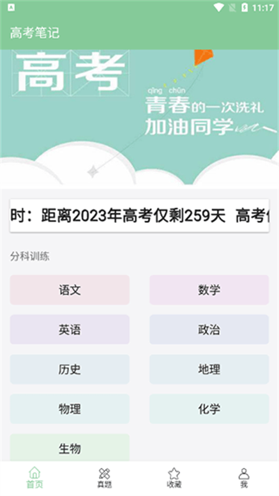 1.在软件首页会显示高考的倒计时,这里有语文、数学、英语、政治、历史、地理、物理、化学、生物的分科练习。