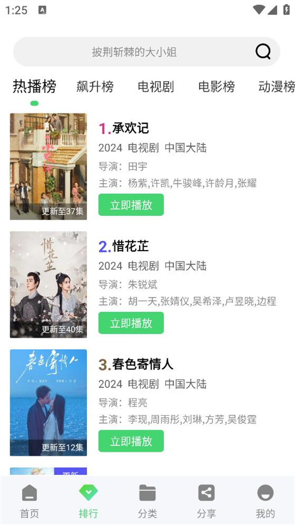 2.进入软件首页后,你可以点击上方的放大镜进行搜索,或者前往“排行”或者“分类”专栏快速找到自己想看的影视剧。