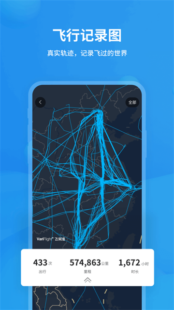 3、该应用程序在飞行轨迹部分显示用户的旅行次数,里程和持续时间信息;