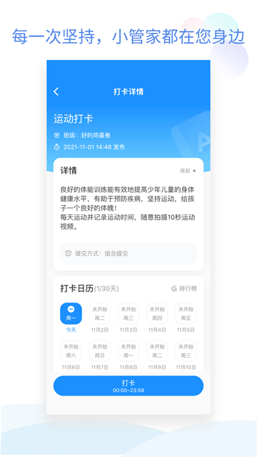 班级小管家支持老师发布作业,家长提交作业后可以在线批改和反馈。系统自动计算完成进度,用于温度填写、读取、打卡等任务,支持定期提醒和完成情况自动统计,快速发起活动注册和信息统计,支持Excel表格一键导出,支持在线考试和成绩录入分析。家长可以查看学生的课堂表现。
