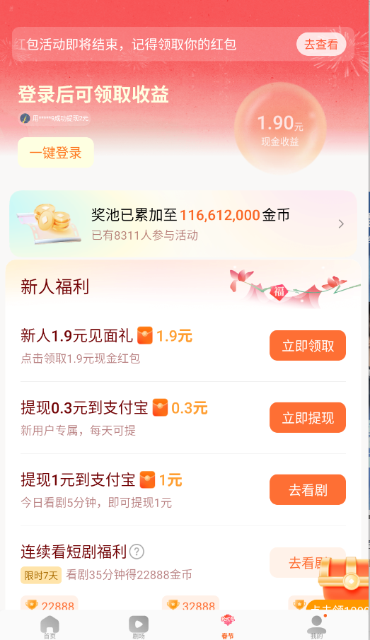 红果短剧用户可以放心放心的观看短剧,所有短剧都可以免费观看全套。软件还整合了番茄免费小说软件的内容,如听书、小说、漫画等,满足用户的各种娱乐需求。通过登录和观看小品,你还可以获得金币,金币可以兑换成现金,最后提取现金到微信或支付宝,软件功能强大,资源齐全,为所有的用户带来了便利哦。