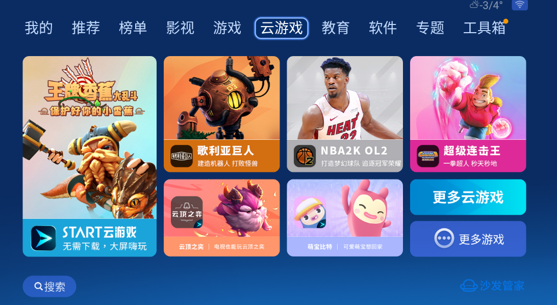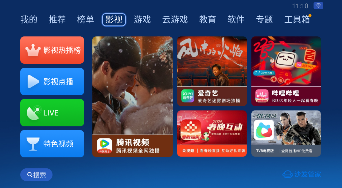 4. 一键搜索:沙发管家依托沙发网络APP搜索技术,提供广泛安全可靠的电视盒软件和游戏。