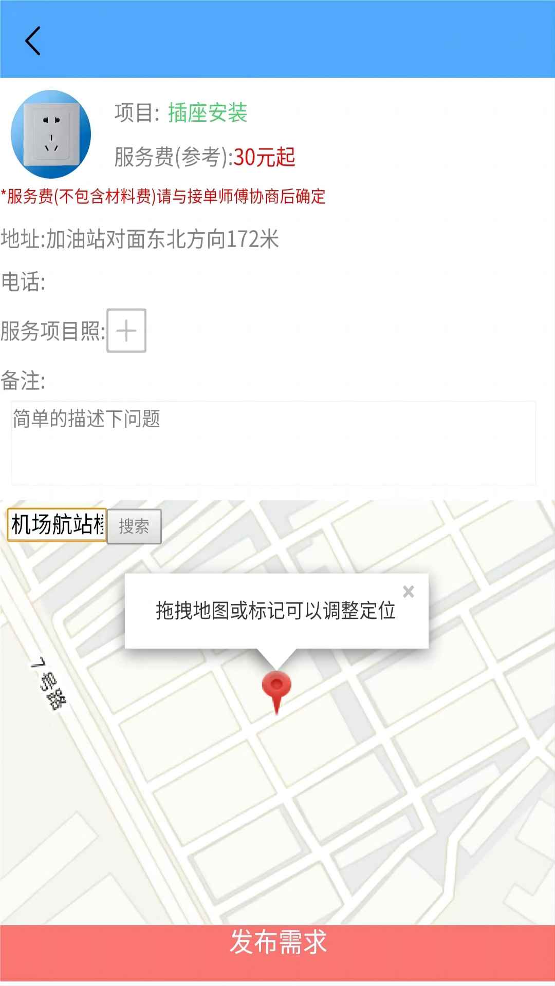 完善详细地址并填写服务需求进行发布,匹配附近师傅;