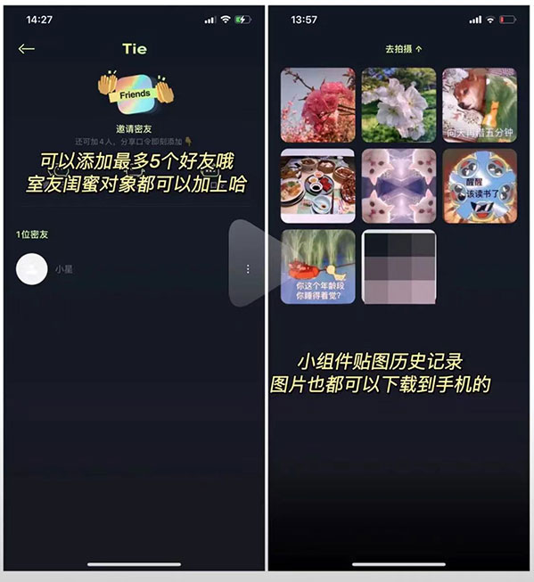 贴贴tietie软件免费是一款免费社交的桌面组件应用,你可以轻松的分享所有的应用,这里有很多的功能在其中,对于视频中的对话和表情包都能使用,轻松的在对方的手机上投送自己的照片,还是很简单的,感兴趣的小伙伴们赶快下载试试看吧。