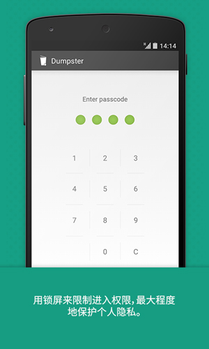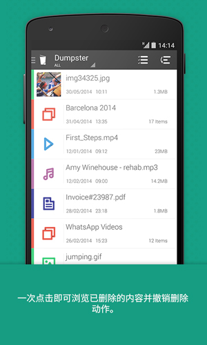 Dumpster回收站是一款非常使用的手机回收站,可以帮助你快速的恢复手机内一家删除的文件,应用内有非常强大的功能,所有删除的文件都将替你管理,用户可以设定时间限制,超过时长的文件将被永久删除,如果有被误删的文件,不管是什么类型的文件格式,都可以快速的进行恢复,而且用户可以设置应用锁,可以完美的保护用户的数据安全!