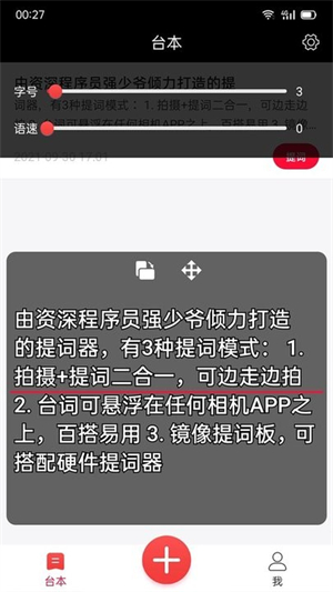 强少爷提词器app提供悬浮窗提示功能,让用户可以在任何相机应用上叠加显示提词文本,拥有丰富的自定义选项,根据个人喜好调整文字大小、颜色以及滚动速度等参数。