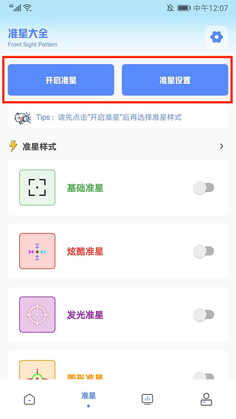 3、在准星界面,用户可根据喜好和习惯选择准星样式并进行设置,可以提高游戏中的命中率,