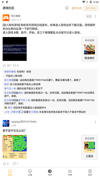 1、下载怀旧游戏馆后进入app,首页可以看到是游戏社区,用户可以在这里看到其他游戏玩家互相交流,还有疑问游戏中遇到的疑问,官方客服也会一一耐心解答