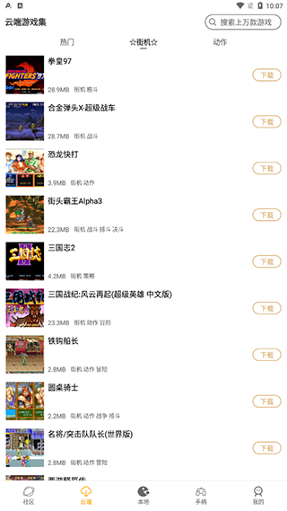 2、菜单栏中心是本地,软件默认为用户提供了实况本地街机游戏,其实大部分这里的游戏都不用下载,可以在线即玩,但是下载下来可以方便再次游玩,而且也不怎么占内存的