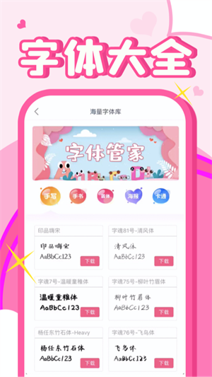 1、多款字体资源:提供海量字体,包括手写字体、卡通字体等。