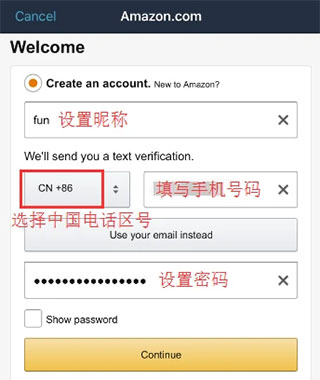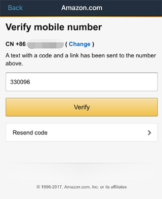 填写手机号注册信息后会收到亚马逊发来的短信验证码,进行输入验证码点击“Verify”验证即可注册成功,自动跳转至APP首页,并处于登录状态。
