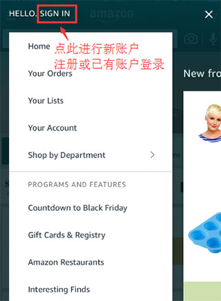 4、同样点击APP左上角进入设置页面,点击“SIGN IN”进入账户注册,已有美国亚马逊账户也可以点此进行登录。