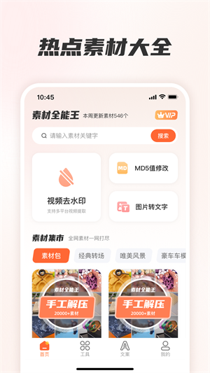 素材全能王是一款拥有海量素材的资源分享平台,拥有包括图片、视频、文案在内的多种文案,所有文案均可免费使用,提供丰富的创作工具。素材全能王可快速筛选近期热门的素材,让新手小白也可以快速上手,拥有海量的图片、视频、音频和文档模板等多媒体素材,可以满足用户在不同场景下的创作需求。