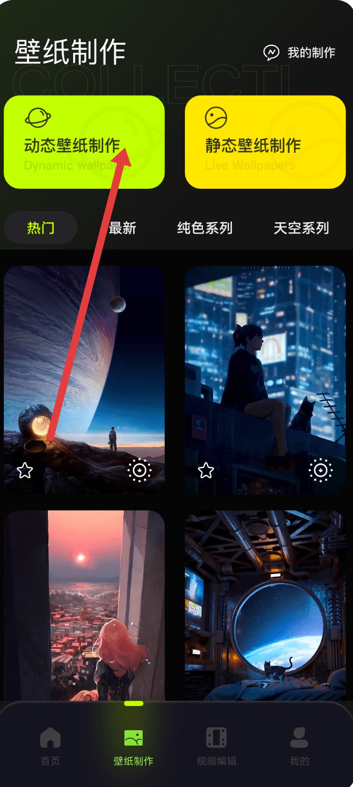 2、界面提供动态壁纸制作和静态壁纸制作入口,下方展示热门壁纸模板,涵盖多种风格。