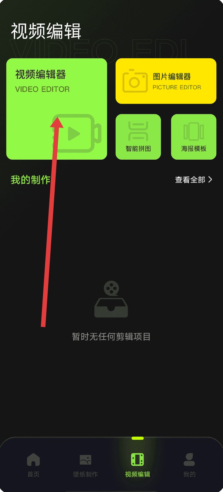 3、视频编辑界面,设有视频编辑器、图片编辑器等功能板块,还有智能拼图、海报模板选项。