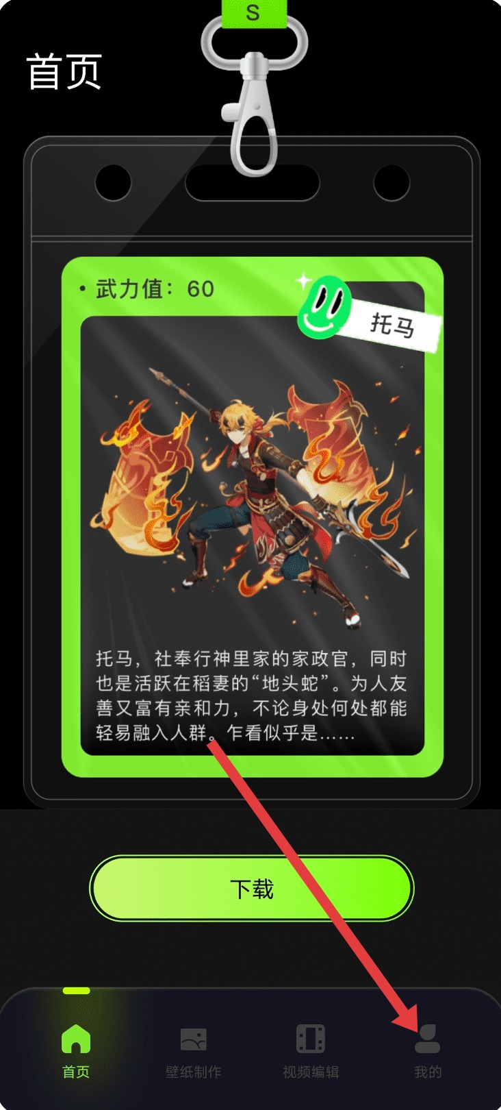 1、制作软件首页,展示角色托马的卡片,含武力值等信息,有下载按钮,底部导航栏有首页壁纸制作、视频编辑我的选项。