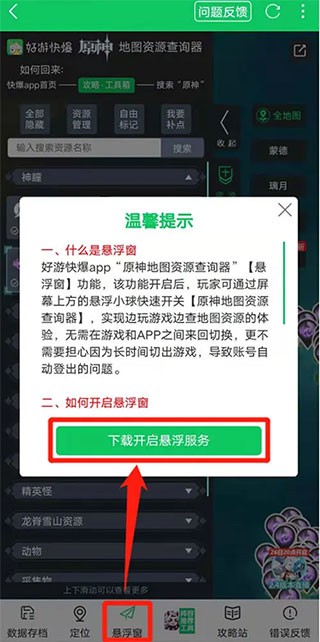 2、进去查询器后,点击屏幕下方“悬浮窗”按钮,再点击“下载开启悬浮服务”,跳转到快爆工具服务下载界面;