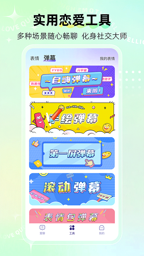 用户点击下方工具,即可进行表情包以及弹幕的添加,有着多种多样的表情包和弹幕可以进行添加,在用户和别人聊天的时候就可以快速发送,而且还有有趣的表情套图可以使用。